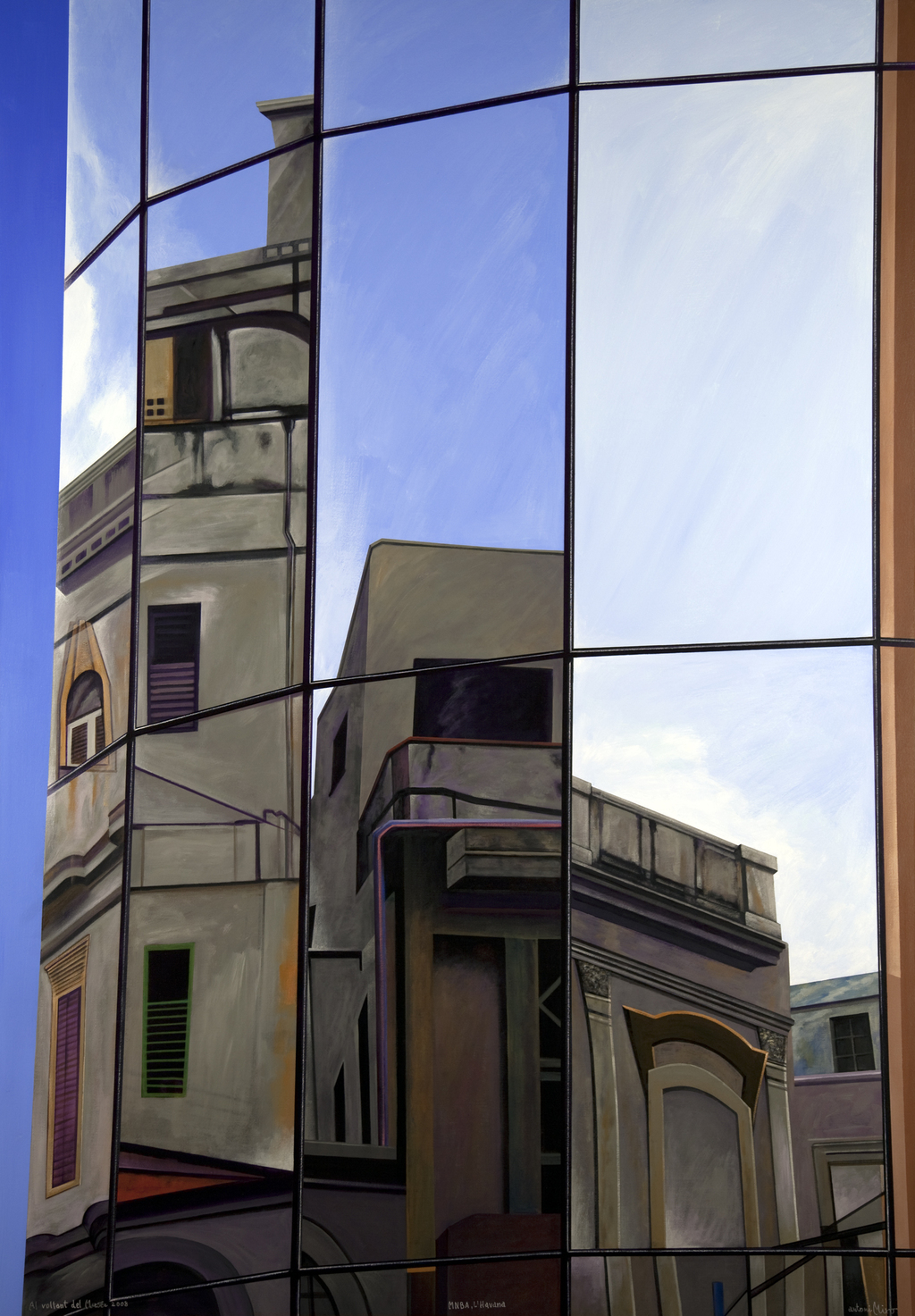 The work has two subjects. Here, the idea is not to consider separately the specular parameters of buildings from another time that are projected to us. Rather, the painting refers to a joint recreation of the process of reflection as a symbolic element. Here, one can draw any number of parallels in the history of art, in which mirrors played a key role in the symbolism of depicting what lay hidden but that needed to be brought into the image to complete the message.