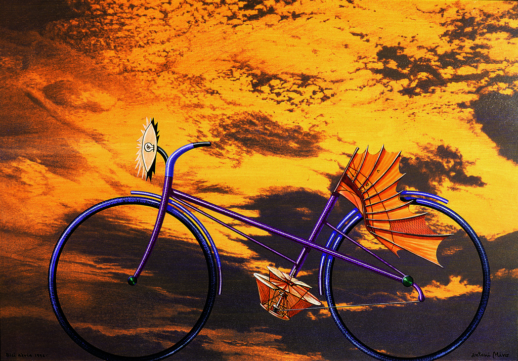 La vista lateral del artefacto aparece apoyada en el borde inferior de la imagen, liberando la mitad superior del lienzo. Se yergue ante un cielo fuertemente teñido de luz amarillenta y plagado de nubes cardadas por el viento. Es sabido que el sol está en el origen de toda energía; también, por lo tanto, es el motor de la eólica, que es uno de los paradigmas de la sostenibilidad medioambiental. Esta bici se concibe para surcar los cielos asistida, en su ligereza, por el viento que haga batir sus alas. Es un símbolo que aspira a convertirse en un modelo de relación adecuada con el entorno. A su cuadro estructural, formado a partir de esbeltos tubos de color predominantemente magenta, con algún detalle en tonos azul y verde, se unen sin radios unas ruedas negras que parecen no precisar rotar para provocar un movimiento totalmente compatible con la conservación de la naturaleza.