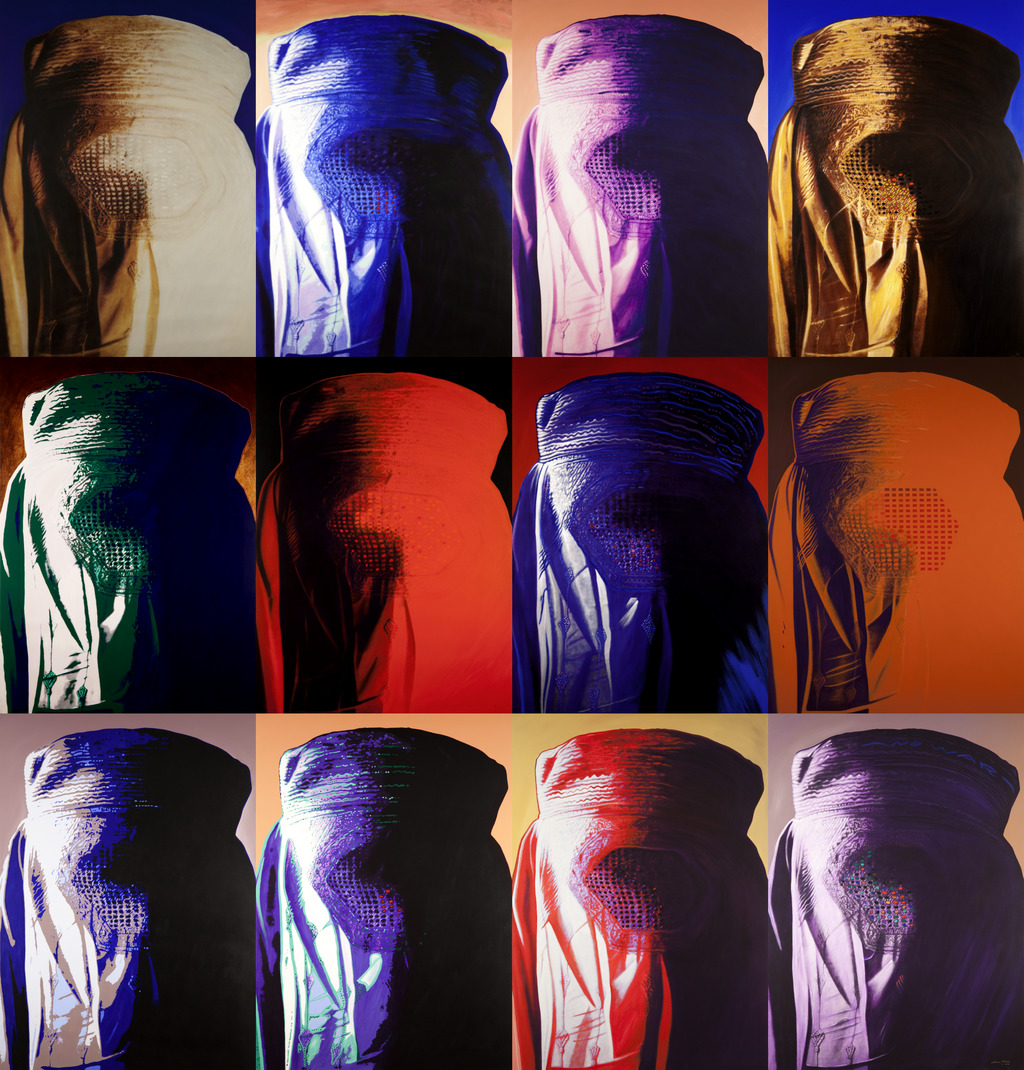 Antoni Miró hace aquí un guiño a una de las estrategias compositivas de Warhol. La representación repetitiva en una obra de los mismos retratos de algunos iconos pop incorporando como único factor diferencial entre ellos el tratamiento cromático, se elabora en este caso partiendo de una imagen contradictoria en su cualidad de retrato, por aquello de negar la representación de la apariencia del rostro femenino. El artista ha utilizado un motivo envuelto de polémica y lo ha modificado en sus tonalidades de forma drástica, generando una diversidad artificial.