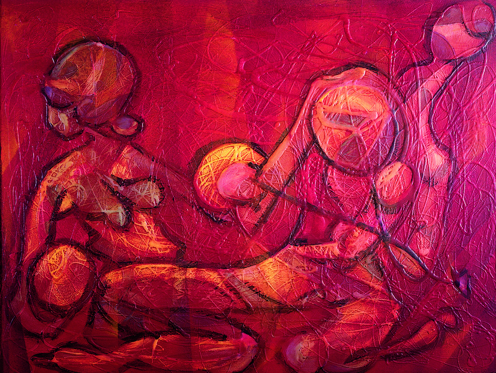 During the experimental phase that is included within the latter part of the “Opera Prima” series, Antoni Miró created several works that explored different artistic languages and pictorial techniques. This painting is a clear example of this. The artist, with a remarkable density of materials and a highly predominant intense red colouration, expressively portrays naked bodies. We can see a woman with a child alongside other figures, which could be a man or a woman with two children. Their physicality is referred to directly as if they were raw meat, and it is not presented as beauty but as suffering, which is increasingly being experienced by innocent people in the world every day.