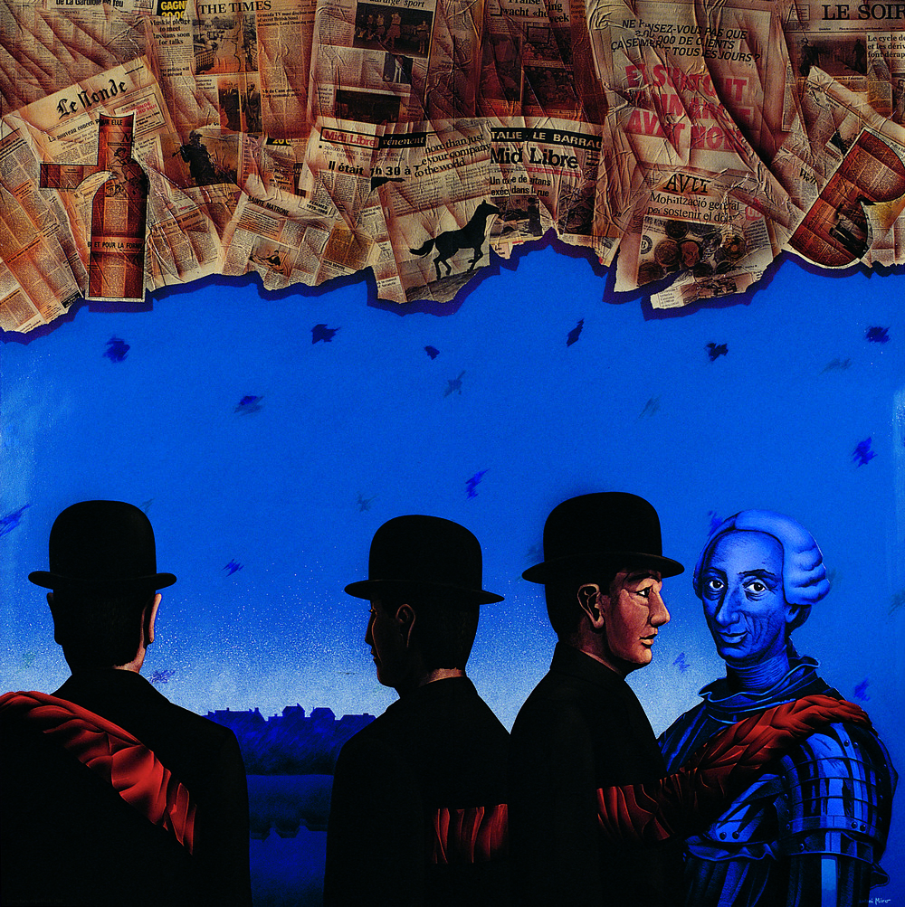 Del mismo modo que puede interpretarse el enigmático cuadro de Magritte como si un mismo personaje taciturno se encontrara sopesando una decisión, el artista trata de incidir en este debate interno mediante esta cita. La luna creciente que se superpone a su cabeza en tres momentos diferenciados no existe aquí. Por el contrario, unos breves trazos sueltos conforman un cielo estrellado que se remata por una franja superior constituida por recortes de prensa internacional pintados, insistiendo en que es un tema de actualidad política.