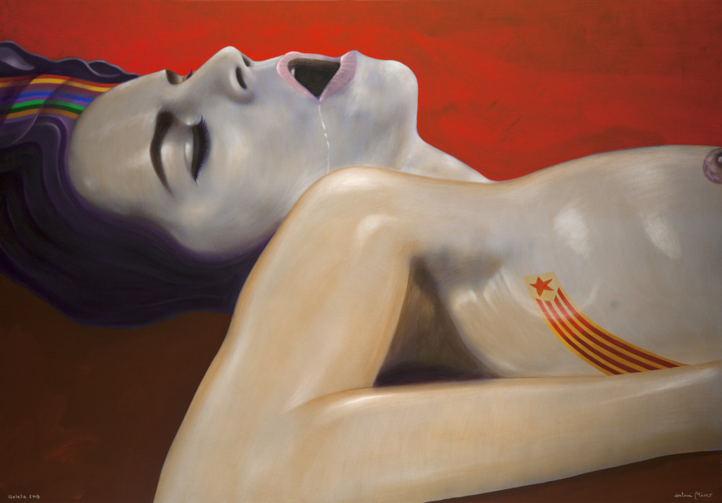 Por un lado, con una especie de arco iris (con un número y un orden de franjas distintos a los reales) tiñendo su pelo se alude sinestésicamente al éxtasis que se atraviesa. Y, por otro, con una senyera maquillada sobre el cuerpo objeto de deseo, se refuerzan las preferencias del artista como sujeto deseante.