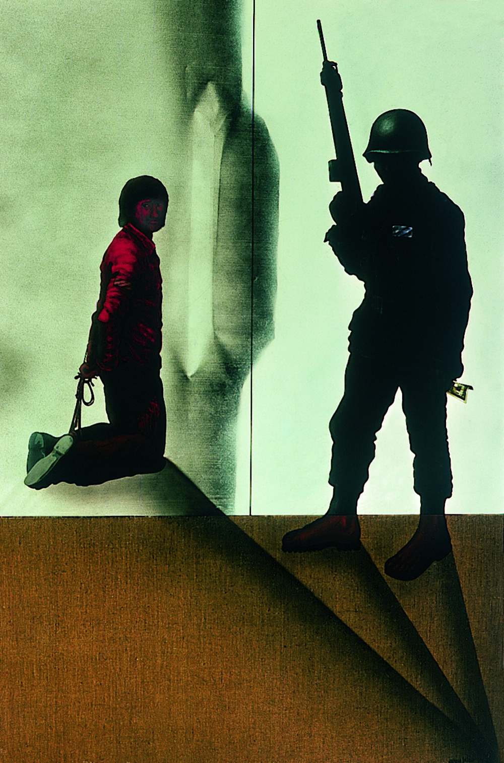 Aquell que el vigila i que prompte l’assassinarà s’acosta completament proveït, armat amb un fusell i amb el casc posat. És aquest un grau de protecció exagerat donada la desigualtat de forces que caracteritza l’enfronta- ment, amb el que es figura la molt destacable barbaritat de l’acte. No obstant això, en un joc forçat de transparències, se’ns mostra el personatge descalç quasi com denotant una corporeïtat que desapareix rere l’uniforme, malgrat la despersonalització que indueix la discrecionalitat de l’acte que ha de culminar.