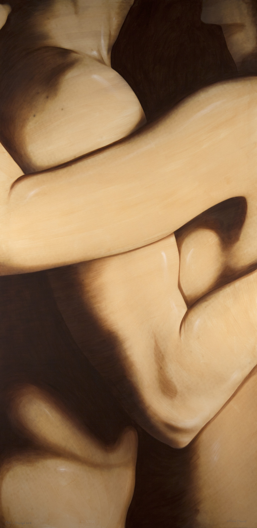 En este gran cuadro, a una escala muy superior a la real, se desarrolla pictóricamente un fragmento de un abrazo visto lateralmente. El cruce entre los brazos se antepone al resto y aparece explícitamente ante nosotros con una clara rotundidad, aunque esté sutilmente modelizado, gracias al hecho de emplear gradaciones de iluminación y manifestar las direcciones de las pinceladas. Uno de los senos de la mujer se acerca a ese primer plano, pero el resto de las partes de los cuerpos que aparecen se dejan en uno posterior, más oscurecidos. Así, por el contraste entre esos dos niveles de profundidad, consigue diferenciar el grado de detalle entre dos realidades situadas, verdaderamente, muy próximas. Con estas estrategias se puede mantener la verosimilitud al tiempo que se pone el foco en determinados elementos escogidos.