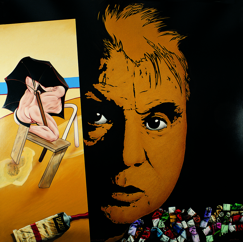 Pero también, de forma explícita, aparece la propia imagen del rostro del pintor, mediante un retrato que es capaz de evocar algunos rasgos de su personalidad. Está pintado de forma monocroma, en tonalidad ocre oscura sobre negro, excepto en lo que afecta a los ojos, que se destacan en blanco. Se invierte así en él la combinación cromática entre el fondo y la figura que se corresponde con la sombrilla negra que se dispone sobre la playa en el cuadro representado. Se posiciona el semblante en el centro del lienzo, ocupando una parte muy importante del mismo. Surge tras la reproducción de su obra y sobre los envases usados, destacando al protagonista como el agente que anima precisamente ese tránsito entre los medios y el fin.