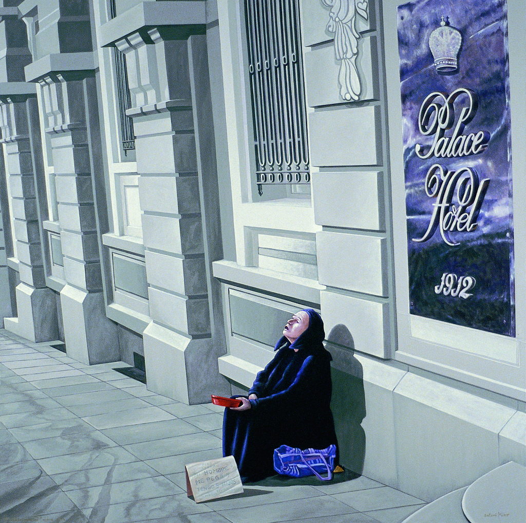 Aquest quadre mostra precisament una dura escena de contrast entre l’opulència i la desolació. És la prova que la consideració positiva en termes generals d’un conjunt no ens eximeix de l’existència de situacions individuals insostenibles, que es veuen neutralitzades per unes altres d’exacerbadament folgades. Davant de la façana de l’hotel de la capital que tradicionalment, junt amb el Ritz, ha simbolitzat tradicionalment el luxe, jau una senyora que demana ajuda desesperadament. El missatge escrit redunda en els mals que pateix: la violència de gènere, l’explotació... la pobresa, en definitiva.