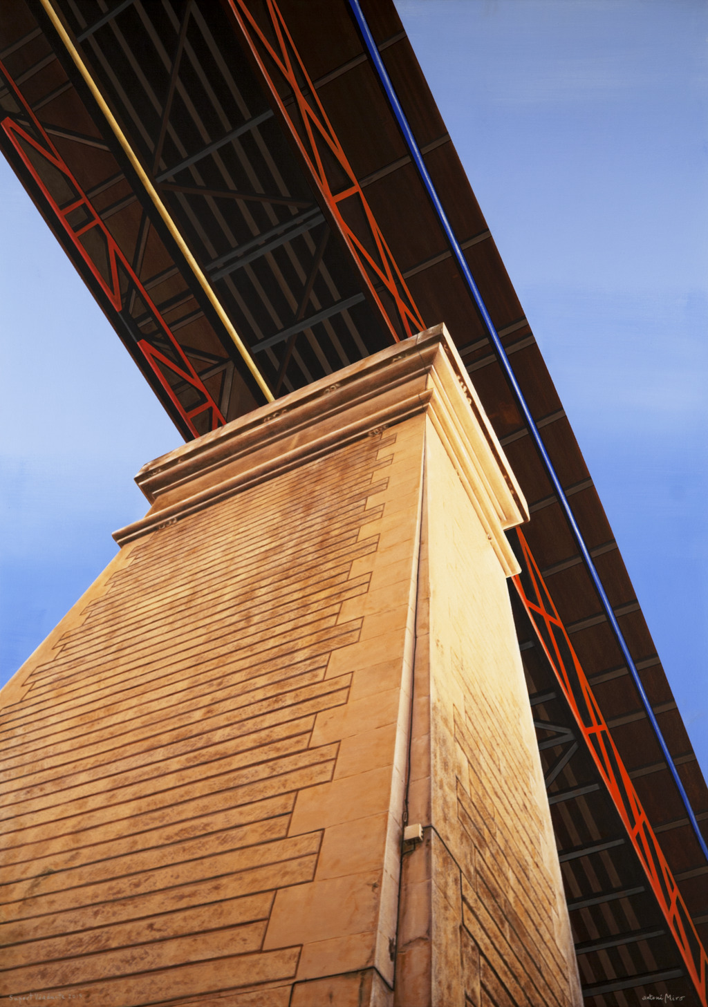 La relevancia tipológica de este puente es suficiente motivo para justificar el interés de su representación. En cualquier caso, para el artista se trata de un artefacto que es impactante en su configuración y escala, y que forma parte de su imaginario personal y del de las gentes de su entorno. Se recurre en este caso a una escena en contrapicado, en la que la viga metálica, una celosía en cajón, y el tablero se materializan sobre una diagonal del lienzo y la pila queda bajo ellos, orientada casi según la otra.