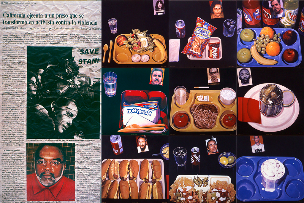 Hi ha, al tractament semàntic d’aquesta gran obra, molts punts de coincidència. Així, la fotografia incorporada del reu, per exemple, ens apropa la imatge d’aquell qui ha de morir, en breu, a mans de la justícia dels hòmens. I la força empàtica amb qui ha de finir, ja d’immediat, els seus dies, s’hi pot establir amb una major facilitat que no pas si l’anonimat presidís la imatge. No és el mateix conèixer l’individu, encara que només siga mitjançant una petita realitat fotogràfica, que ignorar el rostre de qui fa de la història present no un conte, sinó una crua teatralitat, clar. Altra coincidència, pràcticament generalitzada, és la presència d’una safata, amb les viandes que han de resultar ser l’experiència nutritiva dels darrers moments de tots els reus. I quines són aquestes viandes: hot dogs, fruites senzilles, cogombres avinagrats, tomaques, llepolies de xocolata, refrescos de divers abast... L’elementalitat presideix el «banquet» darrer, no gaire estufat ni grandiloqüent. Una sort d’austeritat per a restar ben àgil a l’hora del vol, potser. Però són, sens dubte, les safates de la tristesa, d’allò elemental, del rigor, de la soledat i de la pena. De l’enutjosa tempesta interior. Del crit que no s’escolta, ja. Per a què menjar, o celebrar el darrer sopar, si el final crida, sever, avançant sense esperança la clau mestra del misteri definitiu.