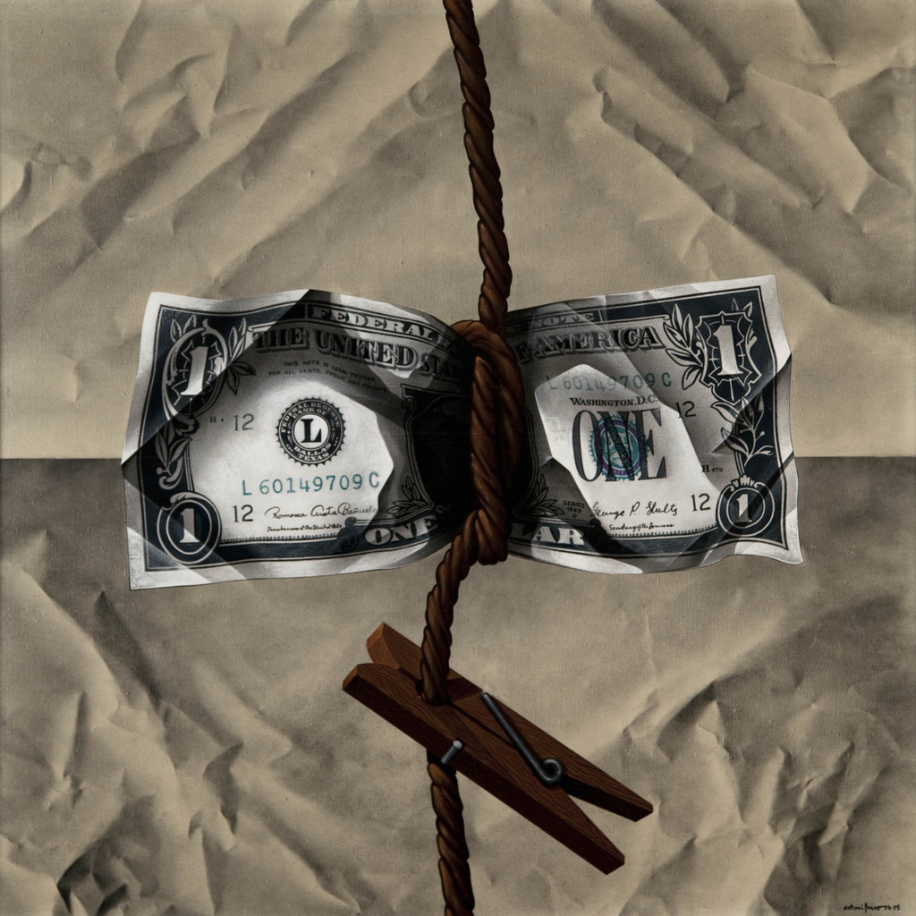 El objeto pictórico representa un dólar americano donde no se ve la figura del presidente George Washington, ya que el billete se presenta arrugado y constreñido en el centro, colgado de una cuerda que simboliza el castigo al que le somete el pintor, quien ha tomado parte determinada, y manifestando una posición encontrada. De la cuerda, también, como un motivo que parece ajeno, pende una pinza de tender, y que da un cierto peso en la escena del ahorcamiento. El billete está empotrado dentro de un ámbito que lo acoge, y que da la impresión de papel retorcido por el tratamiento que el artista resuelve de la luz y de las sombras. Hay como una especie de carnalidad que sirve de colchón a toda la escena que se nos presenta.