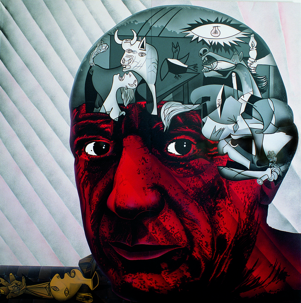 El pintor Antoni Miró construye una nueva realidad a partir de dos vectores coincidentes: el rostro del genial Picasso, y en su interior, en el seno de su cabeza inmensa, fragmentos del Guernica. Una propuesta de 1985 construida en Acrílico sobre lienzo (díptico) y que de 200x200 cm., en cuanto a las medidas se refiere, perteneciendo la obra a la serie Pinteu Pintura. El artista nos presenta el rostro de Picasso ocupando casi toda la superficie del cuadro, muestra inequívoca de la importancia que el autor confiere a la figura del pintor malagueño. Picasso de un color rojo intenso, mira, ¿o quizás nos interpela ? desde el fondo de su mirada. El blanco del globo ocular, con las contrastadas pupilas en negro, inyecta al fin una poderosa mirada que agujerea, reduciendo las distancias, y reclamando la confianza para el acercamiento. El espectador, todos nosotros así pues, quedamos incorporados al deseo del pintor Antoni Miró cuando nos ofrece la posibilidad de dialogar con su imagen, con su deseo de mostrarnos la síntesis, tan cuidadosa, que se incorpora a la lectura del cuadro: Picasso y el Guernica. Picasso y la voluntad de decir muy fuerte acerca del sufrimiento que el dolor procura. Y las causas, todas arbitrarias. Todas malas. Hijas, todas ellas, de una tal vehemencia y fracaso: «... el hombre puede ser destruido, pero nunca derrotado», razona Ernest Hemingway. Y eso ya es mucho decir para ir empezando a discernir los posibles caminos de la voluntad.