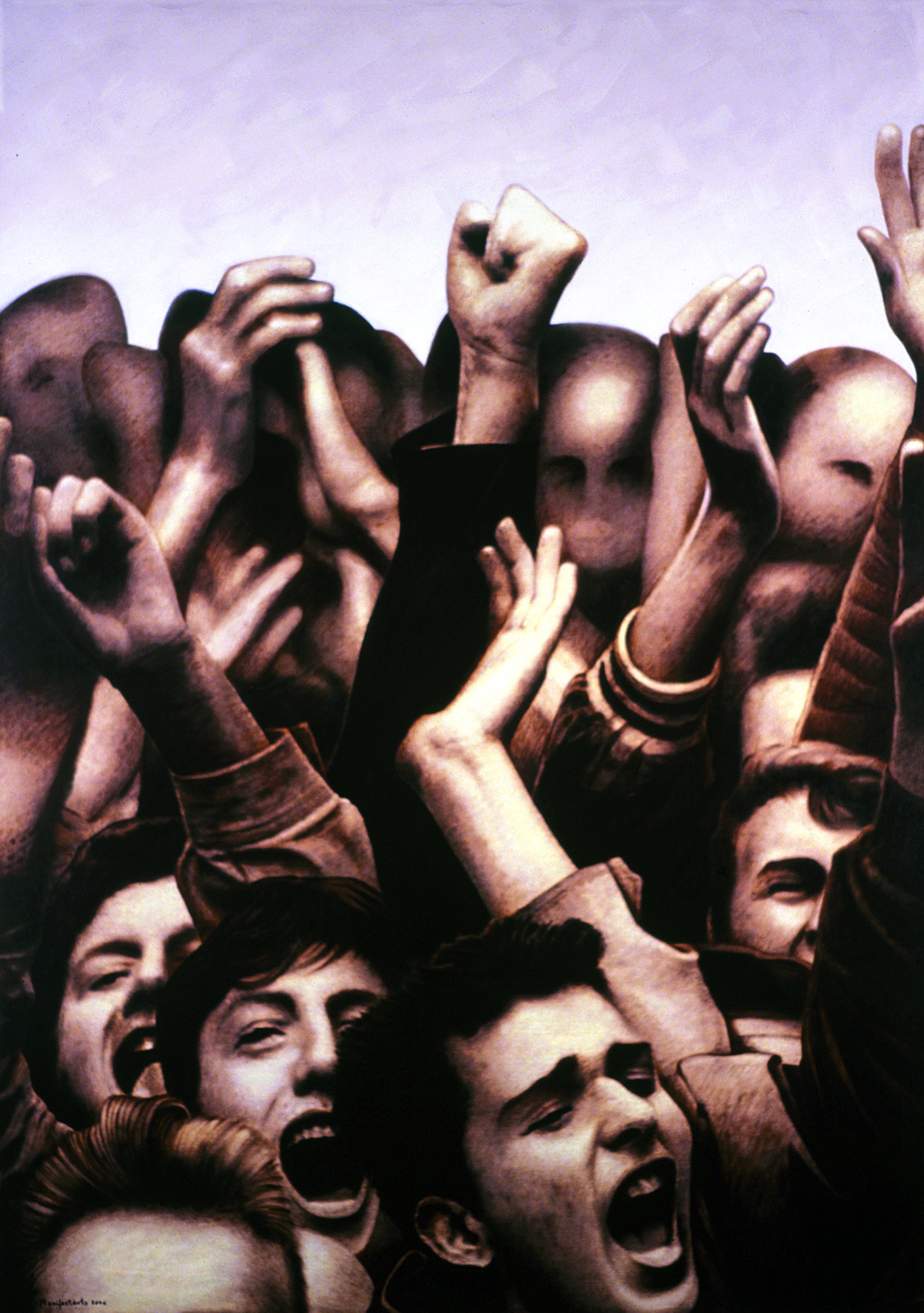 I Antoni Miró, a la seua obra Manifestants, datada el 2006, situada a Sarajevo, i reflectida en acrílic sobre llenç, tot fent unes mesures de 116x114, i pertanyent a la sèrie Sense Títol, captura un espai de vida, un espai on la revolta és la protagonista. Tot el conflicte als rostres dels hòmens que s’hi manifesten. Tota la ràbia als ulls i a les boques esbatanades dels joves que blasmen contra l’opressió. Manifestants en confusió i estreta companyonia per abastar les fites de la protesta: les mans i els punys en alt, símbol evident de l’acarnissament de l’escena. Cares que transmeten, si més no, una situació reivindicativa. Crits que encara podem oir, i persones vora del col·lapse.