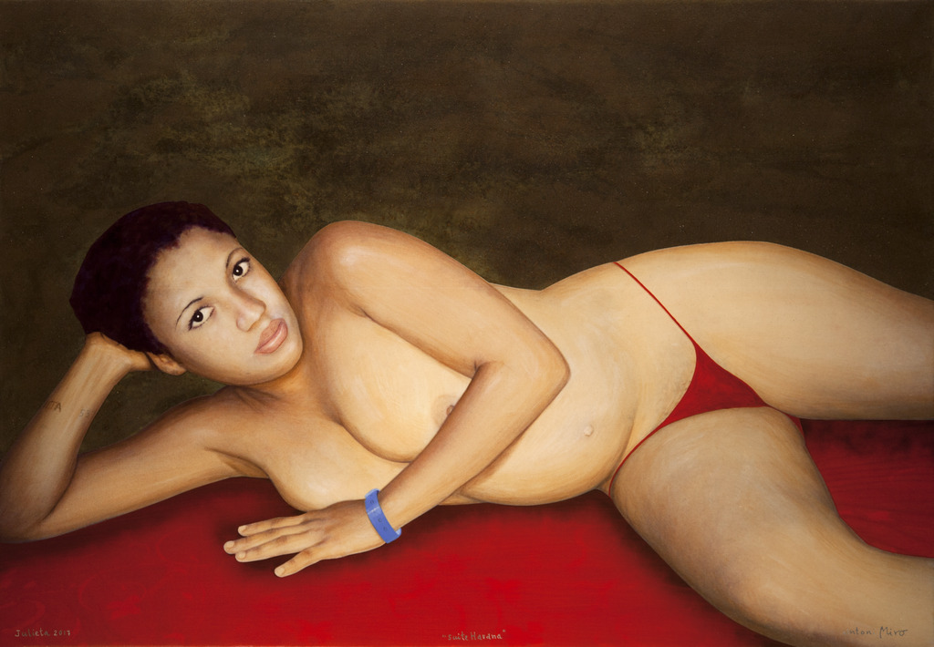 Julieta: ulls desperts, cara relaxada, llavis molsuts i pits turgents, acut a l’escena revestida d’una especial i ben dolça maternitat. I el seu posat, a més de fràgil, també s’abelleix amb la sensibilitat de cofar el seu sexe amb calces vermelles de diminuta proporció.